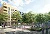 Slik ser planene ut for et av torgområdene som skal bygges på Fornebu. Salgsstart blir trolig i begynnelsen av 2026 og første spadetak tas rundt årsskiftet 2026/2027. Arkitekt Rodeo Arkitekter.