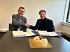 Knut Erik Manstad i OBOS (t.v) og Arild Borgersen i Solid Entreprenør undertegner avtalen. Foto: OBOS