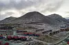 Fjellet Sukkertoppen med de karakteristiske spisshusene i Longyearbyen. Her fra arbeidet i fjor da NVE utredet hvordan man best kan sikre bebyggelsen i Longyearbyen mot ras. De siste årene har det gått flere ras fra Sukkertoppen.
