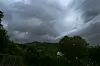 Tunge, mørke skyer over Skaugumsåsen mandag kveld, da det var tordenvær med lyn og mye nedbør.