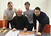 Daglig leder Svein-Erik Løvli (sittende) i Consto Anlegg Nord AS er glad for sin første anleggskontrakt i Tromsø. Her er sammen med prosjektteamet som skal gjennomføre byggingen av høydebassenget. Fra venstre: Anleggsleder Fredrik Alver Okkenhaug, prosjektleder Alexander Korssund og driftsleder Joachim Kjeldsen Fossmo.