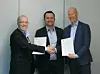 Direktør Jarle Kvalvik i Etat for utbygging i Bergen kommune, daglig leder Johannes Gullbrå og Kenneth Bøe i Constructa Entreprenør etter at samspillskontrakten om Nordnes oppveksttun er undertegnet.