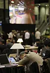 En journalist tar seg en på øret under et EU-møte i Brussel. Foto: Virginia Mayo/AP/NTB
