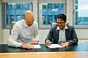 Her signerer Anders Kvåle, styreleder og co-funder for Spacemaker og Daniel Kjørberg Siraj, konsernsjef iOBOS, avtalen som vil gi OBOS AI-teknologi i alle fremtidige utviklingsprosjekter.