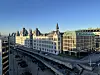 Oslo 194204. Ruseløkkbasarene og Viktoria terrasse. Folk sykler i vårsolen. Under krigen holdt tyskernes Gestapo og Sicherheitsdienst til i Victoria terrasse. I april 1946 skrev Aftenposten: 'Da det gikk mot slutten av krigen begynte tyskerne å barrikadere seg her i Oslo. Et resultat av dette var også gjenmuringen av de mange verksteds- og butikkvinduer i Ruseløkkveien under Victoria terrasse.FOTO: NTB / NTB