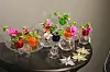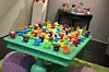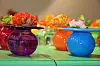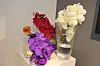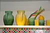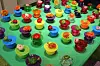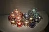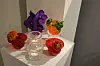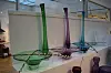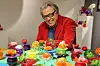 Han viser oss et gammelt bord med kulebein, som er malt knallgrønt og dekket med små vaser i alle regnbuens kulører. Årets kolleksjon består av både tette (opale) og transparente farger.