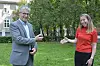 Direktør Thorbjørn Thoresen takker regiondirektør Kristin Willoch Haugen fra Innovasjon Norge for tilliten og tildeling av 15 millioner for å utvikle fremtidens byggekonsept for Forsvaret.