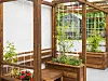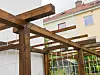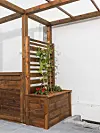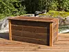 Hun opplyser at treverket er kokt i pigmentert olje over 80 grader, hvor oljen danner en hinne som beskytter materialene mot temperatur- og fuktighetsendringer.