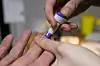 Eivind Andreas Floberg får et lite stikk i fingeren, for å sjekke kolesterol og blodsukker.Foto: Malin S. Strandberg