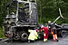 Lastebilen som brant i Gudvangatunnelen blir her undersøkt etter brannen 5. august 2013. På grunn av de store skadene var det ikke mulig å fastslå brannårsaken.