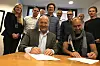 Fra venstre: Nina Mellem, Torge Railo, Eldar Brynjulfsen, Flemming Idsøe (alle fra Omsorgsbygg), Kjetil Stenersen (OEC), Arnt Rian, Nils Hjulstad, Tord Sandvik (alle fra HENT). Foran adm.dir i Omsorgsbygg Per Morten Johansen og adm.dir. i HENT AS, Jan Jahren.