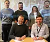 Utbyggingsdirektør Eldar Brynjulfsen i Omsorgsbygg og produksjonssjef Kaj Jacobsen i HENT er enige om å bygge Vollebekk barnehage. Bak står Gaute Høyland, Øyvind Høin og Mina S. Munthe-Kaas fra Omsorgsbygg, og Jan Martin Smørdahl fra HENT.