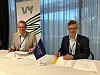Konserndirektør Arne Fosen i Vy Tog og administrerende direktør Jon-Erik Lunøe i signerer leiekontrakten verdt 240 millioner kroner over 10 år.