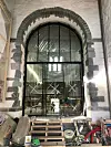 KLIMABUFFER. Mellom forhallen og skipet er det satt inn en stor glassvegg med ståldører, som både vil fungere som vindfang/ klimabuffer og som et akustisk skille. Foto: Arkitektkontoret Schjelderup & Gram