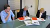 Kultur- og idrettsbygg Oslo KF inngikk fredag fire kontrakter som inneholder møblering av det nye Deichmanske hovedbibliotek. HMI Haugland Miljø Innredning AS er en av de nye kontraktspartnerne. Åsmund Øvrevik (til venstre) og Ivar Haugland fra HMI, med direktør i Kultur- og idrettsbygg Oslo KF, Eli Grimsby. Foto: Kultur- og idrettsbygg
