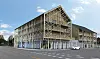 Stasjonsgården består av 18 leiligheter fordelt på to bygningskropper over første etasje. I den ene blir det fire boliger fordelt på to etasjer, og i den andre blir det fjorten boliger fordelt på tre etasjer. Illustrasjon: Porsgrunn Bamble Borgestad Boligbyggelag
