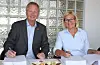 F.v. administrerende direktør Dag Andresen, Veidekke Entreprenør og direktør Eli Grimsby, Kultur og Idrettsbygg (KID) signerer kontrakten.