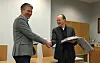 Bjørn Sikkeland (t.v.), leder for Asker Entreprenørs avdeling i Follo/Østfold, og ordføreren i Trøgstad kommune, Ole André Myhrvold signerer kontrakten.