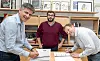UNN-direktør Tor Ingebrigtsen (til venstre) signerer kontrakten som sikrer Consto avtalen om å bygge det nye PET-senteret i Breivika. Til høyre avdelingsleder for Consto i Troms og Finnmark, Ronny Bøckmann. Bak utbyggingssjef ved UNN, Tor-Arne Hanssen, med.