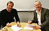 Rune Storm i Ruta Entreprenør og Jon Søland i Omsorgsbygg under signeringen.