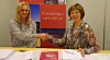 Daglig leder i Wegger & Kvalsvik, Britt Røed Lohne (t.v.), og Rigmor Hansen i Undervisningsbygg er enige om en samspillsavtale.