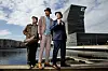 Elias Holmen Sørensen som Kjell Jensen (fra venstre), John Carew som Benny Fransen og Anders Baasmo Egon Olsen planlegger å stjele «Skrik» fra det nye Munchmuseet.Foto: Nordisk Film