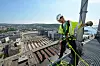 Byggeindustrien fikk være med da Øyvind Holsen Foss, Peter Sommerseth Jaer, Johannes Weisser, Even Berntsen, Birk Dahle Ness, Torbjørn Solheim, Piotr Cyprian Rajski, Thomas Horgen (hengende under), Jørgen Valde, Kristoffer Eriksen etterlignet det ikoniske bildet «Lunch atop a skyscraper» fra Rockefeller Center på Manhattan for å profilere selskapet.Alle foto: Stefan Offergaard