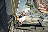 Thomas Horgen gjør seg klare til å fire seg ned fasaden på Posthuset.