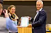 Beste foreleser: Konsernsjef Per Kristian Jacobsen deler ut Norconsultprisen 2017 til Klaartje De Weerdt, førsteamanuensis ved NTNU. Foto Julie Gloppe Solem, NTNU