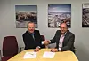 Bjørnar Bendiksen (til venstre) og Steinar Myhre under kontraktssigneringen