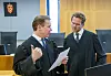 Noen kan ha betalt det russiske sikkerhetspolitiet FSB for å skade Ølen Betong-saken. Det fremgikk av sluttinnlegget for Regjeringsadvokaten fredag. Her betongselskapets advokat Per Ristvedt (til venstre) i samtale med regjeringsadvokat Fredrik Sejersted.