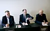 Riksmekler Nils Dalseide så på klokken under pressemøtet i forbindelse med bruddet i frontfagsforhandlingene. Dalseide skal de neste dagene forsøke å få til enighet mellom Fellesforbundets Jørn Eggum (t.v.) og Norsk Industris Stein Lier-Hansen (t.h).