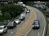 Biler i kø på E16 i retning mot Fretheimtunnelen i Sogn tirsdag ettermiddag, etter at veien ble stengt på grunn av et steinras i Nærøydalen.Foto: Statens vegvesen webkamera / NTB scanpix