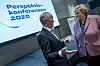 Statsminister Erna Solberg (H) og finansminister Jan Tore Sanner (H) i samtale på regjeringspartienes perspektivkonferanse. – Nå er det alvor, varsler Sanner.