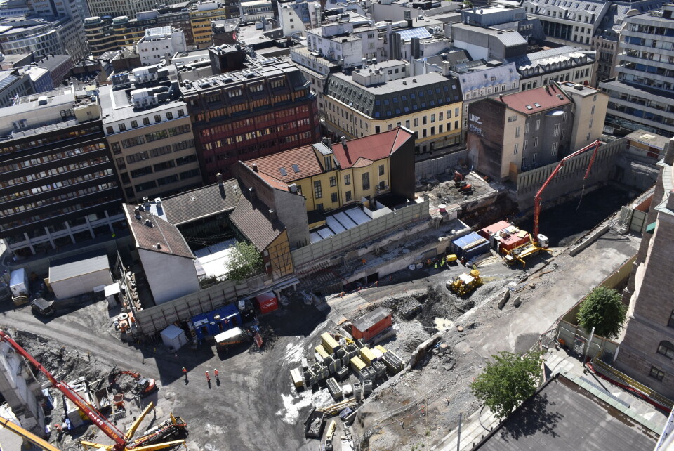 Slik ser det ut bak byggegjerdene når Høyblokka rehabiliteres.