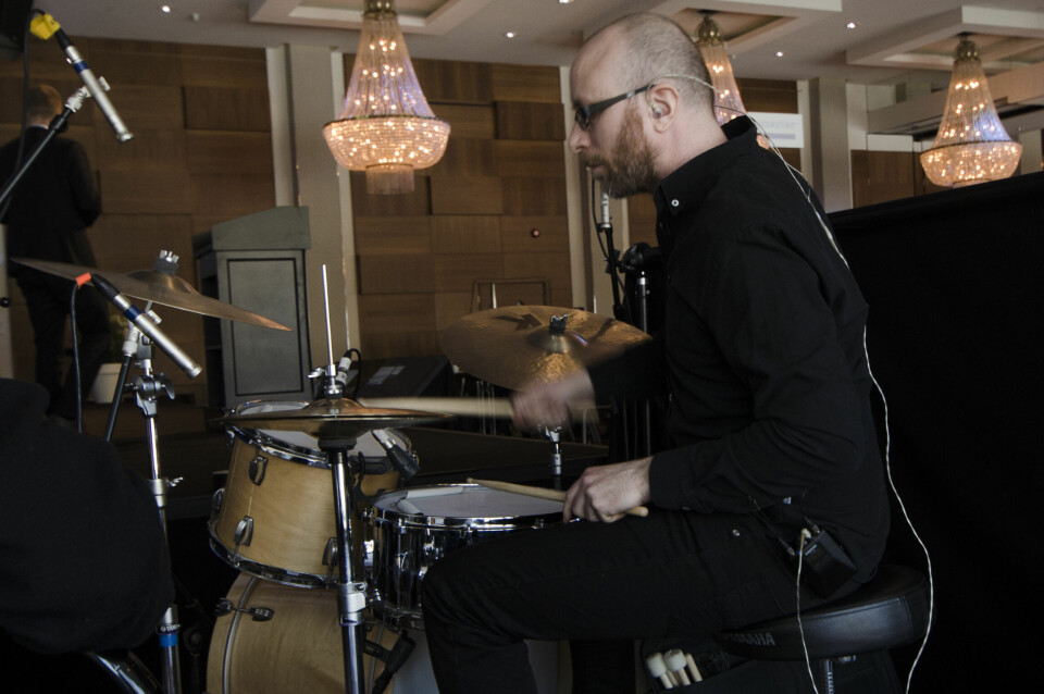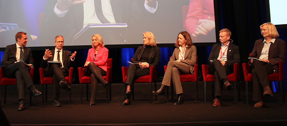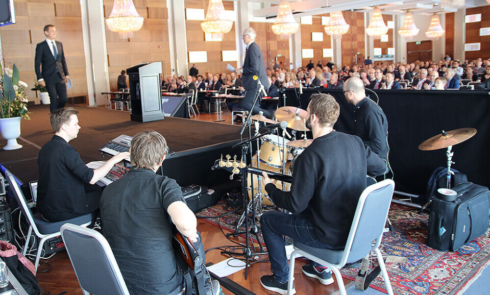 ILDDÅP: Møteleder Christian Chramer inviterer sin sønn Magnus opp på scenen for å Byggedagene 2018. Foto: Svanhild Blakstad