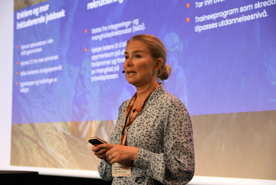 Generalsekretær Tone Nakstad i Norsk forening for fjellsprengningsteknikk delte ut prisen for Årets Anlegg.
