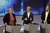 Statsminister Erna Solberg (H) flankert av partilederne Jonas Gahr Støre (AP) og Siv Jensen (FrP) under partilederdebatten torsdag kveld.