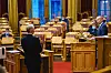 Sp-leder Trygve Slagsvold Vedum (til høyre) med spørsmål til finansminister Jan Tore Sanner (nærmest) i Stortinget ved en tidligere anledning.