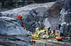 Folk fra Vegvesenet bruker lift for å undersøke fjellet på motsatt side av veien av der raset gikk.