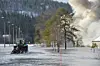 Brannmannskaper og politi fraktes i båt trukket av traktor til våningshuset som tok fyr på en flomisolert gård i Vassbotna i Namdal i februar 2015.