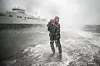 Dmitrij Gordejev og sønnen Daniel på fem år i sjøsprøyt og regn ved ferjekaia i Moss søndag ettermiddag. Ferjene ble innstilt på ruten mellom Horten og Moss, men trafikken kunne starte opp igjen natt til mandag.