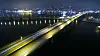 Biler på E18 kjører over motorveibrua i Drammen en sen desemberkveld. I bakgrunnen sees Bragernes.