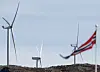 Vimpel i Fitjar sentrum med tre av vindturbinene i Midtfjellet vindpark i Fitjar kommune i bakgrunnen. Illustrasjonsfoto: Jan Kåre Ness / NTB scanpix